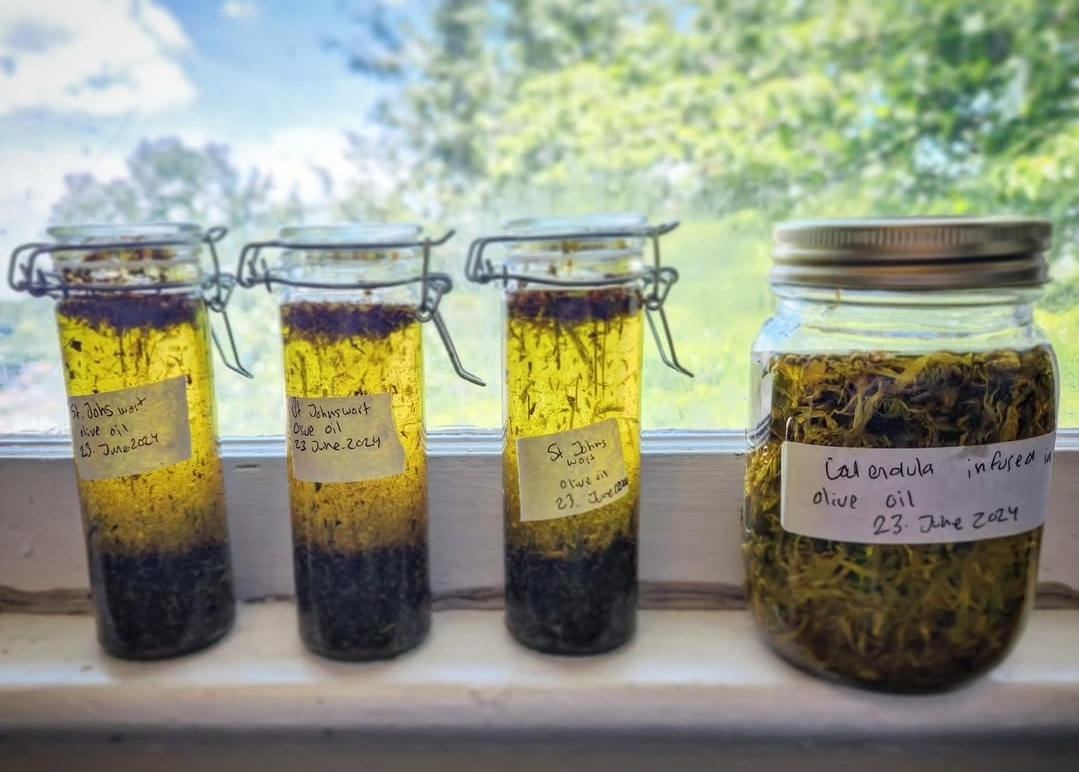 Herbal oils draw out the fat-soluble constituents in plants, allowing you to create a topical remedy that supports blood circulation, tension relief, and tissue repair. Unlike salves or lotions, oils stay soft, absorb gradually, and are incredibly versatile: you can use them directly on the skin, turn them into a salve later, or add them to bath salts and more.